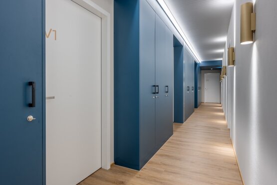 Die Farbpalette der Praxis ist sorgfältig ausgewählt und umfasst beruhigende Blau- und Grüntöne, die mit warmen Holzfarbtönen kombiniert werden. Diese Farbkombination fördert nicht nur eine entspannende Atmosphäre, sondern spiegelt auch die Natur wider – ein wichtiger Aspekt in der Dermatologie, wo das Wohlbefinden des Patienten im Vordergrund steht. Blau steht für Vertrauen und Professionalität, während Grün für Heilung und Erneuerung steht. Goldene Akzente setzen elegante Highlights und verleihen dem Raum eine gewisse Wärme und Exklusivität.